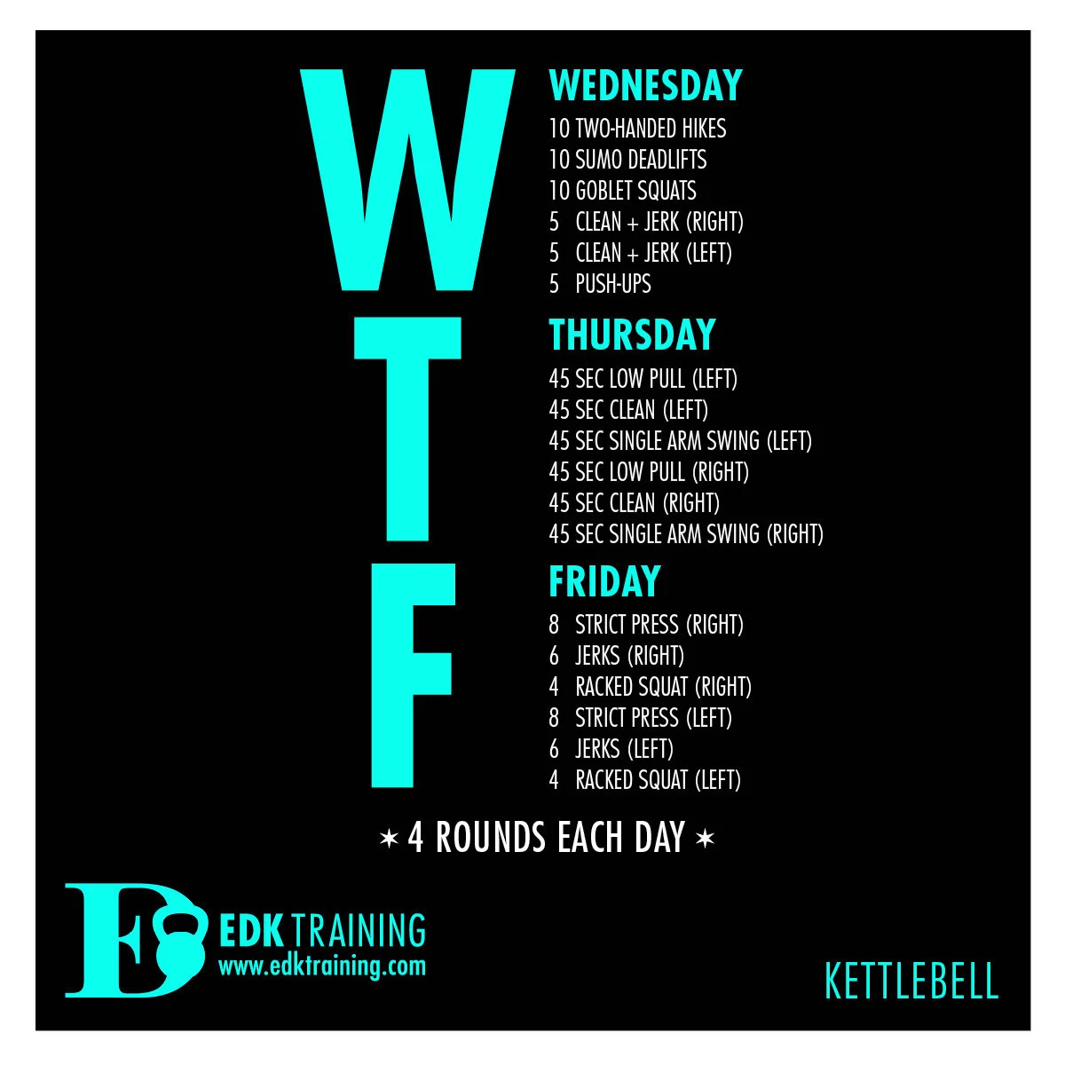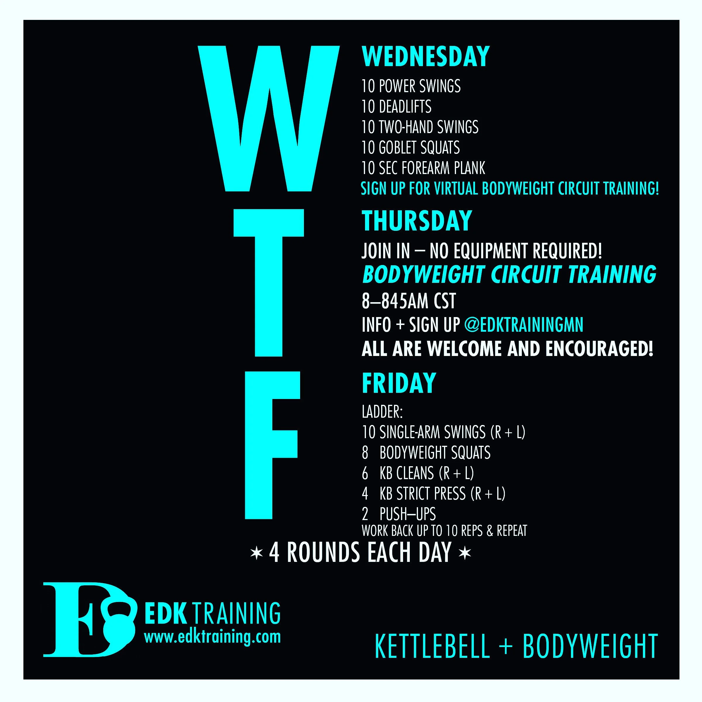 Designed for Wednesday, Thursday, Friday – or any day of the week – mix and match exercises and workout days for an ideal variety. Choose the option that will keep you moving and motivated through your busy week. Follow EDK Training on Instagram or Facebook for new WTF uploads and bookmark this page for easy reference!